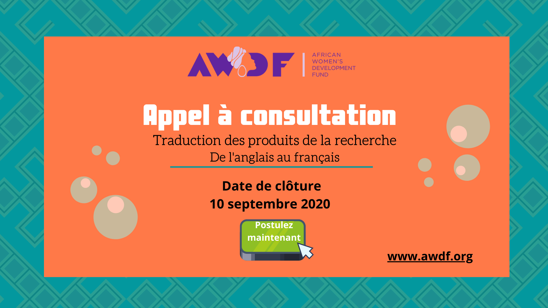 Veuillez envoyer un CV, un courriel de présentation, un échantillon de traduction et une indication de votre tarif pour la traduction anglais-français à consultants@africlub.net/awdf avec l’objet du courriel: Candidature pour le poste de traducteur-conseil, produits de recherche NCDs. Les courriels doivent être adressés au ” responsable des ressources humaines “.
