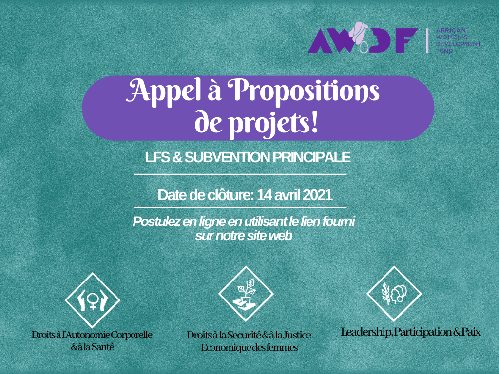 Dans le cadre de notre initiative Le Sud Aux Rênes du Leadership (LFS) et de notre Subvention Principale, African Women’s Development Fund (AWDF) a le plaisir de recevoir des propositions de projets venant de toutes organisations et groupes éligibles dirigés par des femmes en Afrique et dans certaines parties du Moyen-Orient ( Liban, Palestine, Jordanie, Irak, Yémen).