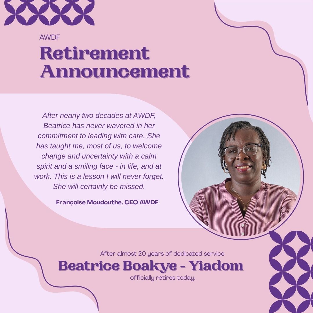 After almost 20years of dedicated service, Beatrice Boakye-Yiadom, our Programmes Manager-Resourcing Movements, retires today. Throughout her time at the African Women’s Development Fund (AWDF), Beatrice has played an integral role in shaping and delivering our grantmaking initiatives, building strong relationships with partners like you and advancing our mission to resource, strengthen and uphold women’s rights organisations and feminist movements across Africa. Her passion, leadership and commitment have left a lasting impact on our work and the feminist movements that we serve.